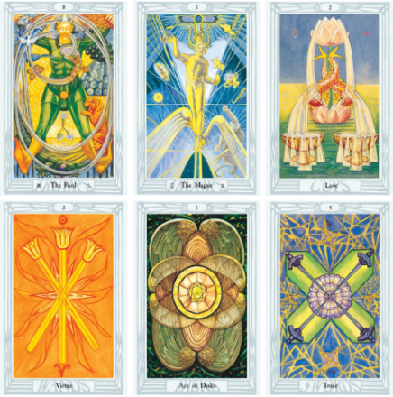 Ligesom ophavsmænd og kvinde til Rider-Waite-Smith, var Aleister Crowley også en del af Golden Dawn (The Hermetic Order of Golden Dawn), men havde en anden vision med hans tarot version. Dette er også tydeligt når du sidder med Thoth kortene i hånden.